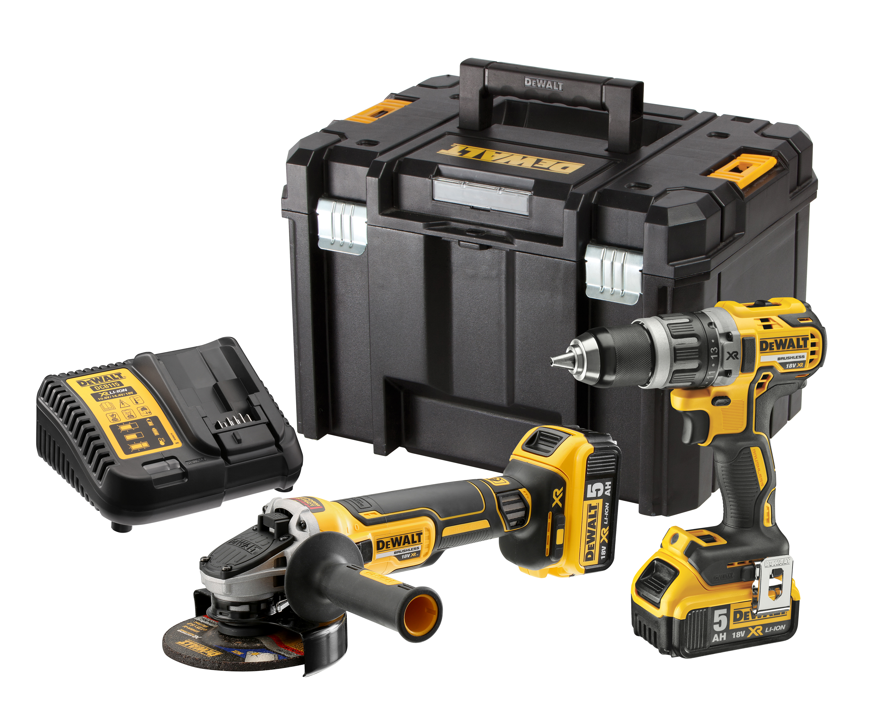 Kompaktowy zestaw elektronarzędzi Dewalt: bezszczotkowa wiertarko-wkrętarka 18V, bezszczotkowa szlifierkakątowa18V 125mm, 2 akumulatory 5.0Ah, ładowarka wielonapięciowa, walizka TSTAK.