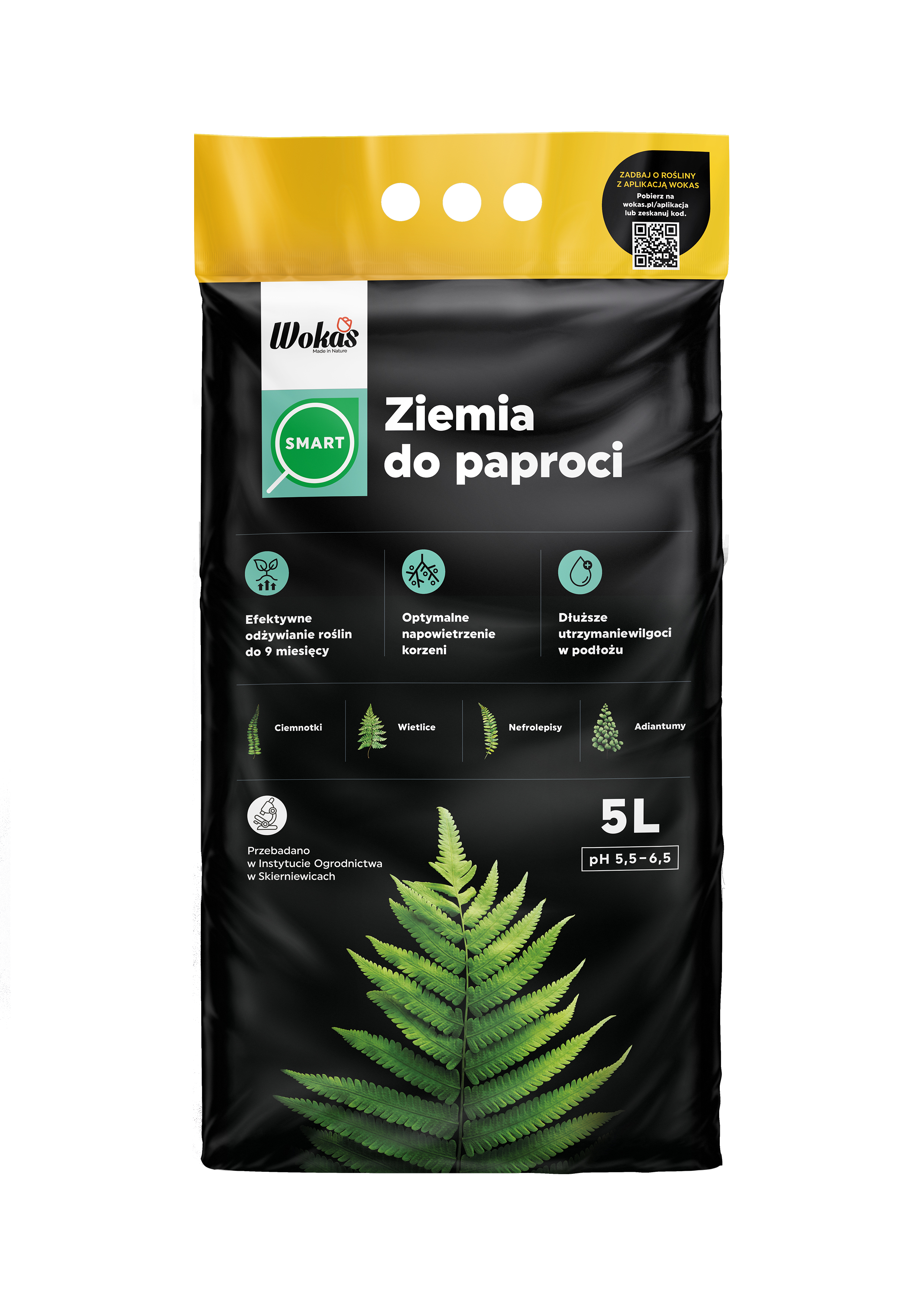 WOKAS SMART to podłoża ogrodniczych przeznaczonych do wszechstronnego stosowania w uprawie roślin ozdobnych, ziół, owoców i warzyw skomponowana z wyselekcjonowanych surowców najwyższej jakości. Do produkcji ziemi zastosowano innowacyjny system odżywiania roślin oparty o długodziałający nawóz mineralny, organiczny oraz zeolit. Dodanie minerału glinokrzemianowego pozwala zabezpieczyć ziemię przed nadmierną utratą składników odżywczych znajdujących się w podłożu. Właściwości jonowymienne zeolitu oraz zastosowanie kompostu zapewniają roślinie stały dopływ makro i mikroskładników przez długi okres czasu. Zastosowanie glinokrzemianu zabezpiecza podłoże przed niekontrolowanymi zmianami poziomu składników odżywczych i zasolenia wynikających z różnych warunków przechowywania produktu w opakowaniu. Dodatkowo w celu poprawy struktury podłoża zastosowano perlit. Składnik ten podobnie jak zeolit utrzymuje stałą strukturę ziemi, poprawia retencję oraz zwiększa porowatość podłoża. Przeznaczona do uprawy większości paproci i paprotek, takich jak zanokcica, ciemnotka, adiantum, płaskla, dzbanecznik, dawalia. Do stosowania w donicach w domu, na balkonie i na tarasie.
