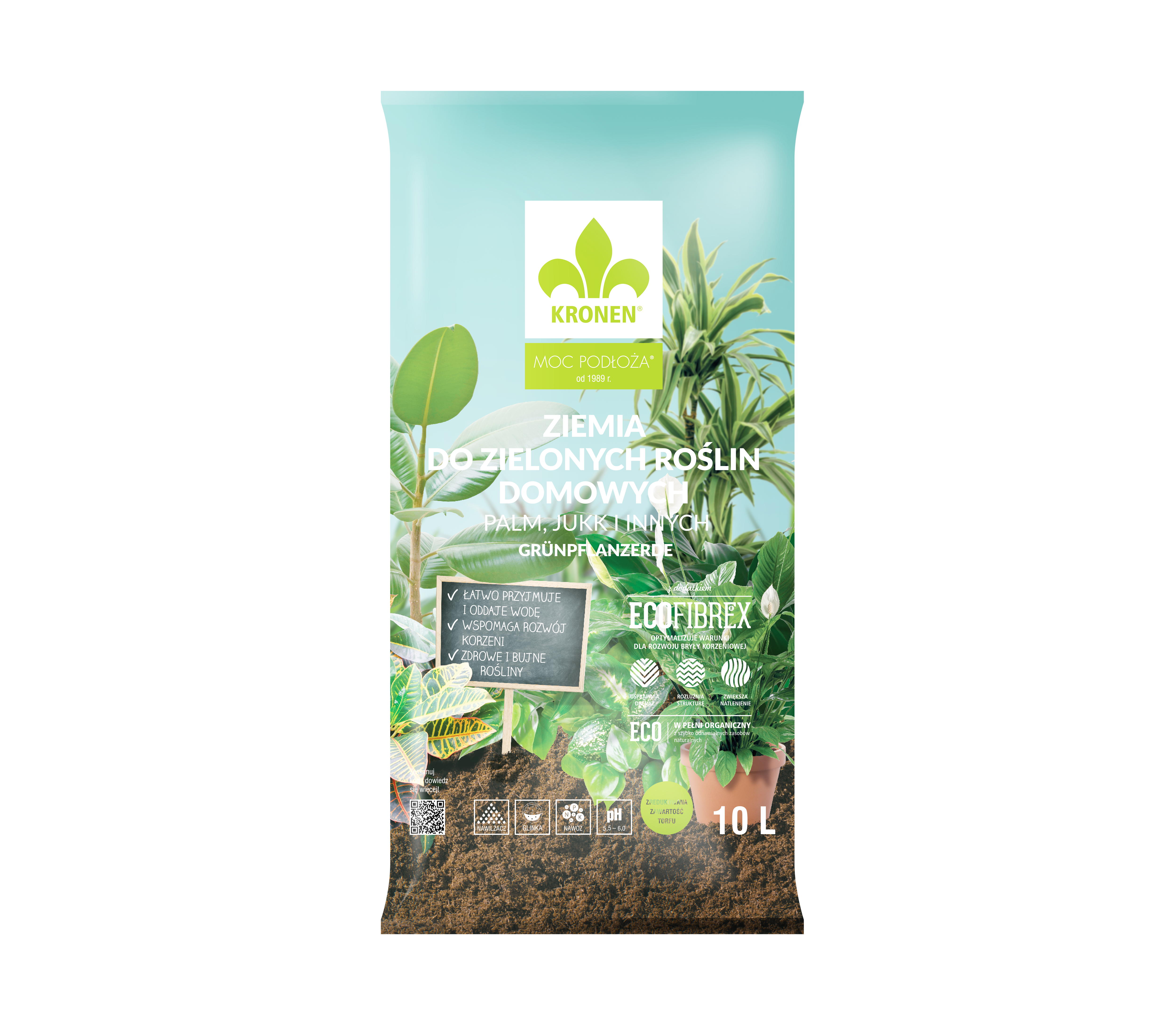 KRONEN® ziemia do zielonych roślin domowych, palm, jukk i innych to gotowe do użycia podłoże przeznaczone do sadzenia i przesadzania roślin w pomieszczeniach. Wyprodukowane na bazie frakcji torfu o różnym stopniu rozkładu i glinki. Opakowania zawierają włókna drzewne ECOFIBREX®, które w większych pojemnikach korzystnie wpływają na strukturę i drenaż podłoża.
