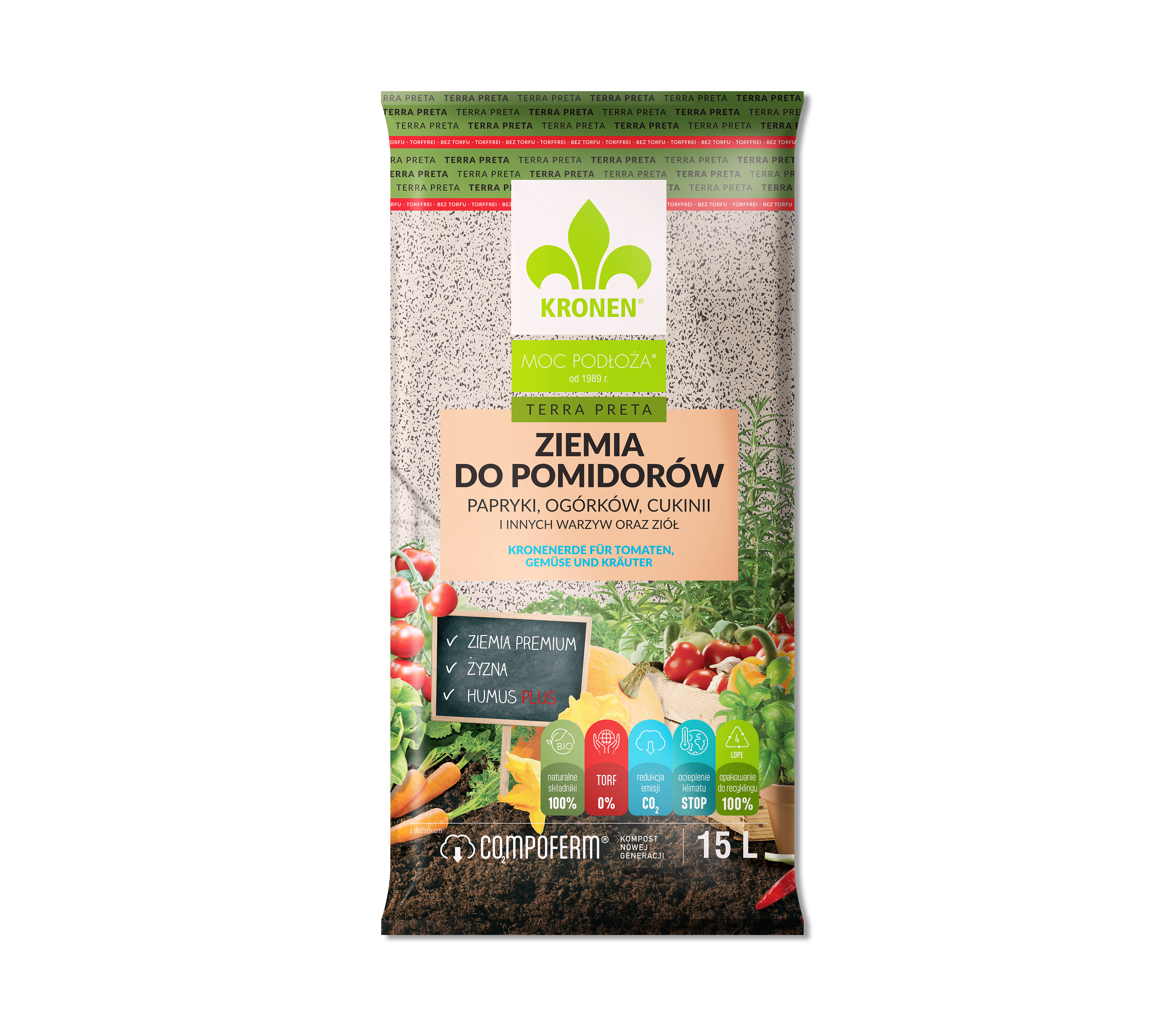 KRONEN® TERRA PRETA ziemia do pomidorów, papryki, ogórków, cukinii i innych warzyw oraz ziół, nadaje się również do innych warzyw psiankowatych takich jak: bakłażan (oberżyna), miechunka (rodzynki brazylijskie), pepino, oraz dyniowatych: kabaczek, patison, dynia olbrzymia, dynia piżmowa, kiwano, ogórek melonowy, melon, arbuz (kawon). Ma wiele zalet dla roślin i dla środowiska. BEZ TORFU