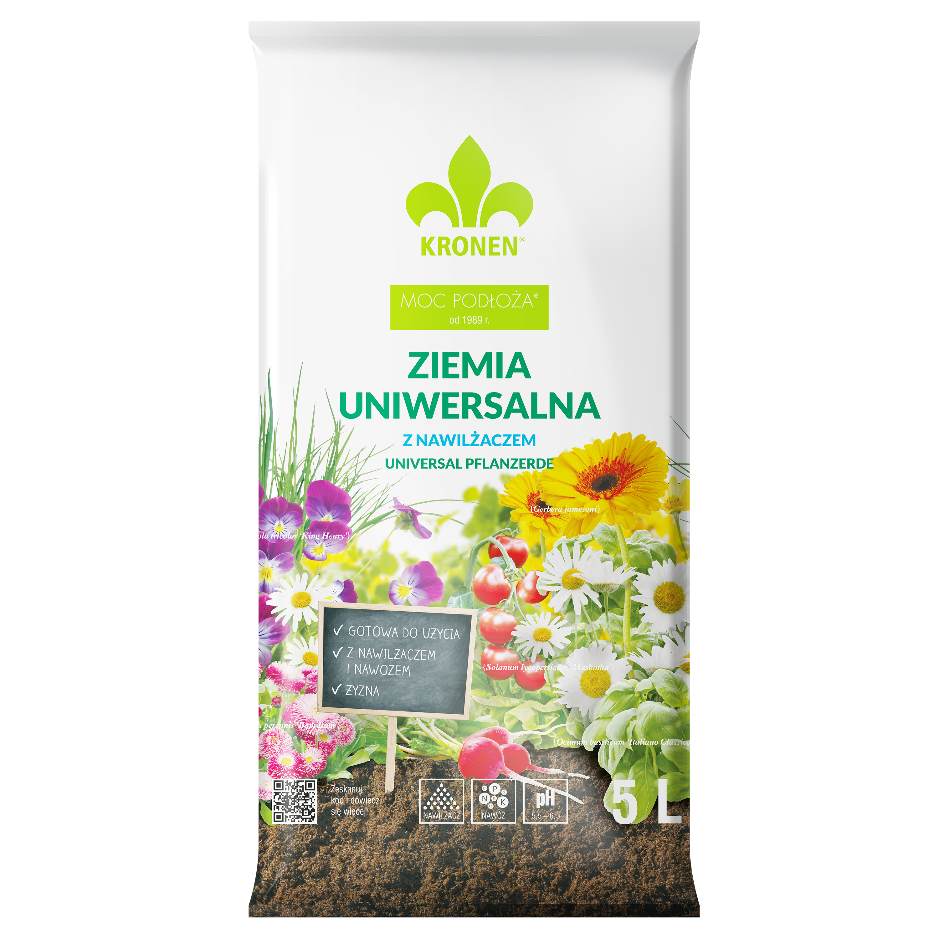 KRONEN® Ziemia uniwersalna z nawilżaczem jest przeznaczona do sadzenia i przesadzania wielu gatunków roślin zielonych i kwitnących, warzyw, ziół, bylin, iglaków w domach na balkonach, tarasach i w ogrodach, z wyjątkiem roślin kwaśnolubnych. Ziemia uniwersalna to wysokowartościowe, naturalne podłoże wyprodukowane na bazie torfu wysokiego o różnym stopniu rozkładu w oparciu o recepturę i doświadczenie profesjonalnych ogrodników. Ziemia uniwersalna zawiera nawilżacz i nawóz wieloskładnikowy z mikroelementami.